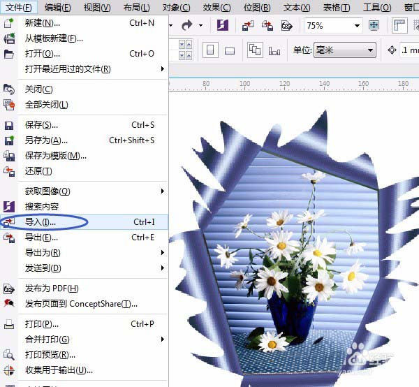 7、导入图片,单击“对象”菜单→图框精确剪裁→置于图文框内部,变成箭头时→对准半内部轮廓单击,调整,取消内部轮廓线颜色,完成操作。