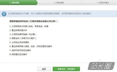 业务审核资料填写二:根据提示步骤,提前准备好资料,点击》=准备完毕,填写资料。这里需要填写,商户负责人信息和商户基本信息。