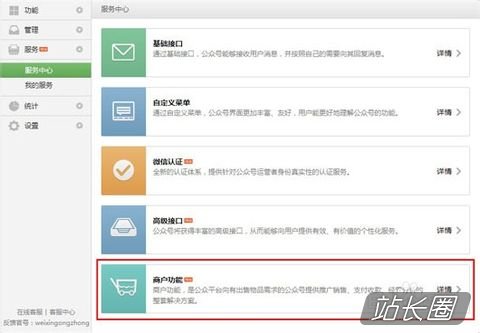 登录微信公众平台,点击“服务”功能栏下的“服务中心”模块,再点击右侧的“商户功能”模块。