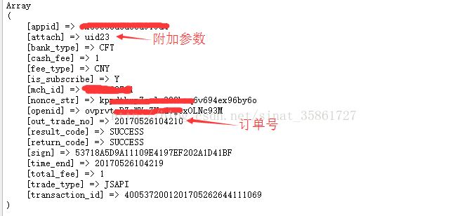 我们可以将这里返回的xml数据记录下来,然后打开看看$out_trade_no就是在支付之前我自己设置的订单号码,$attach就是设置的附加参数。
