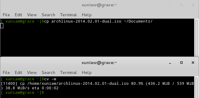 你也可以添加几个选项到cv命令,就像其它命令一样。一个有用的选项是让你了解到拷贝或移动大文件时的预计剩余时间。