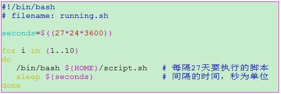 1) 在脚本running.sh中设置要执行的次数,这里假如10次,每次间隔27天,script.sh为要执行的脚本