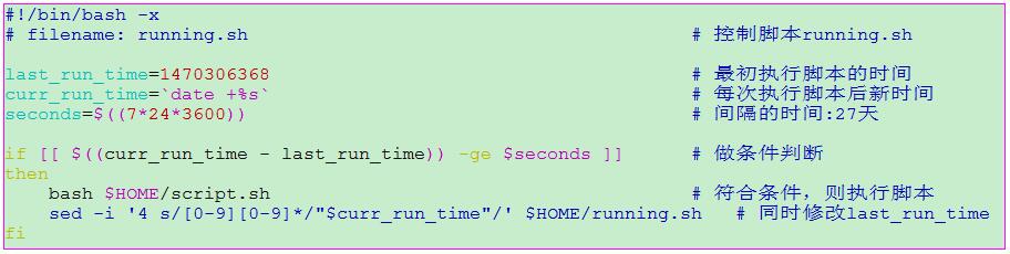 1) 每天定时执行running.sh脚本,再在脚本running.sh里面判断,当间隔时间满足条件时