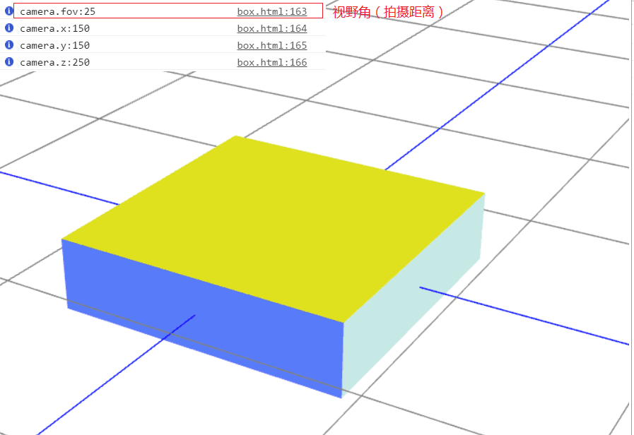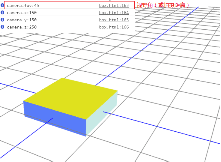 //透视照相机参数设置 var fov = 45,//拍摄距离 视野角值越大,场景中的物体越小 near = 1,//相机离视体积最近的距离 far = 1000,//相机离视体积最远的距离 aspect = window.innerWidth / window.innerHeight; //纵横比 var camera = new THREE.PerspectiveCamera(fov,aspect, near, far);
