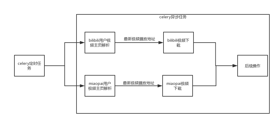 在运行的时候,celery会将配置好的优质用户列表定时发送到对应网站的解析接口异步执行,筛选出最新发布的视频播放地址,交给对应的下载接口异步下载,下载完成之后再异步调用后续操作。因此需要启动一个celery beat进程发送定时任务,以及若干celery异步任务去执行解析和下载操作,对于比较大的视频,下载会相当耗时,建议根据任务列表的多少合理分配异步任务的个数。