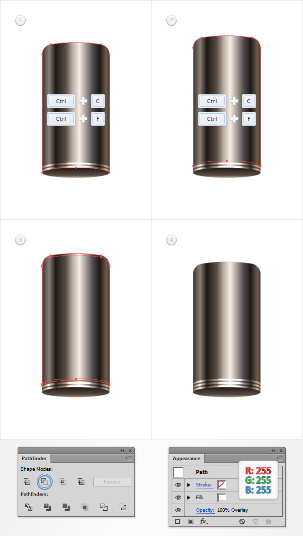 第6步 禁用对齐网格(视图>对齐到网格),然后去编辑>首选项>常规,并确保在键盘增量设置为1px的。重新选择你的“ 帽 “形状,使两个副本在前面(Ctrl-C组合>控制-F>控制-F )。选择顶部的副本,并简单地将其移动1像素使用的向上箭头按钮的键盘了。 重新选择在这个步骤做两个拷贝,然后单击负接待按钮,从探路者面板。 确保生成的形状保持选中,并集中在外观面板(窗口>外观)。选择现有的填充,配有一台白色取代现有的线性渐变(R = 255 G = 255 B = 255),然后只需点击“ 不透明度 “一段文字,打开透明度飞出面板。开启混合模式下拉菜单,然后选择覆盖。到底你的瘦,新的形状看起来应该在第三的形象。