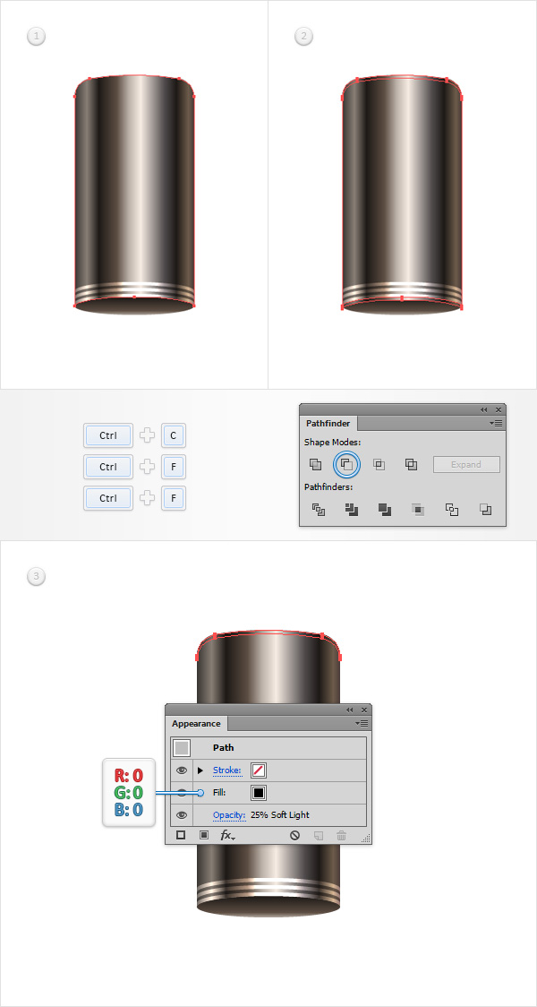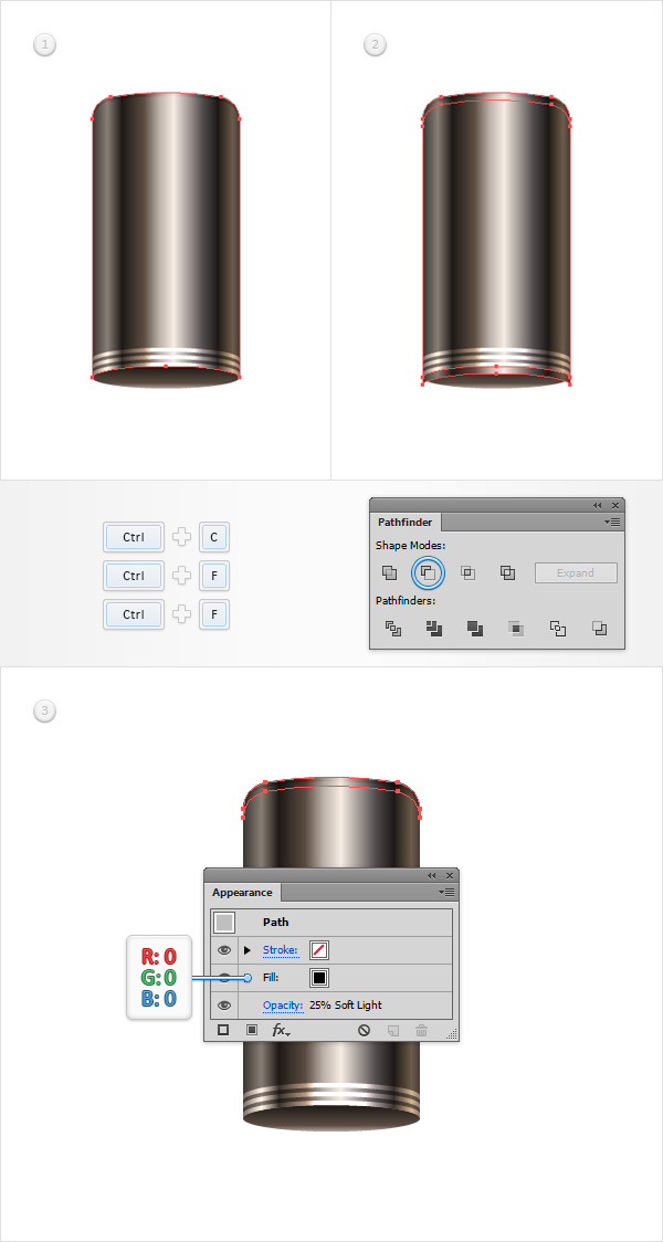 第11步 请确保您的“ 帽 “形状被选中,并在前面的两个副本(控制-C>控制-F>控制-F )。选择顶部的副本,并移动它的3px下来。 重新选择的两个副本,并单击负接待按钮,从探路者面板。填补由此产生的形状,黑色,降低其不透明度为25% ,改变混合模式为柔光。