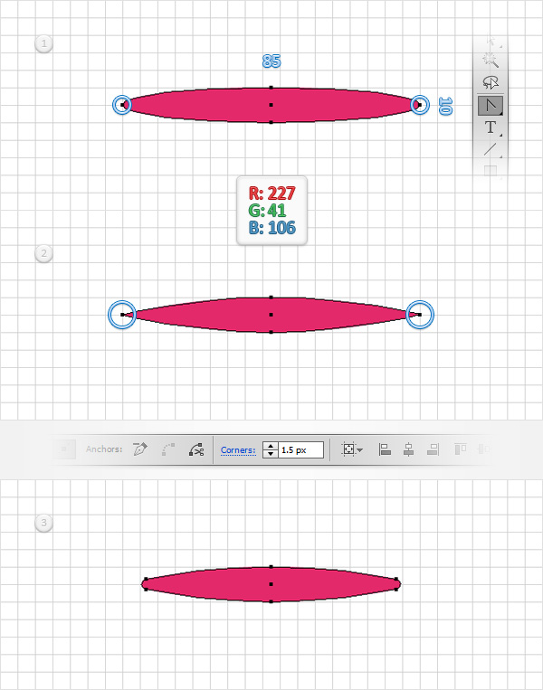 3,创建艺术画笔,并添加一个简单的背景 第1步 启用对齐网格(视图>对齐到网格),并返回到网格线间隔加入5px,所以干脆去编辑>首选项>参考线和网格,并输入5的网格线间隔框。 使用椭圆工具(L) ,创建一个85 X 10px的形状,并设置填充颜色为R = 227 G = 41 B = 106。切换到锚点工具(Shift-C键),并可以点击左侧和右侧锚点(在第一幅图像突出显示)。抢直接选择工具(A) ,选择左,右锚点(在第二幅图像突出显示),移动到控制面板,专注于角部分,并将其设置为1.5px。到底你的粉红色形状应该像在第三的形象。