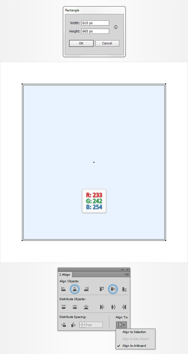第3步 挑 矩形工具(M) ,简单地点击你的画板来打开 矩形 窗口。进入 610 在 宽度框中,665的 身高 框,然后单击 确定。填补了这一新的形状与 R = 233 8 G = 242 B = 254。 接下来,你需要围绕这个矩形,所以打开对齐面板(窗口>对齐)。设置对齐到画板(打开飞出菜单,进入显示选项,如果你不能看到对齐到部分,如图下图),然后只需单击水平居中和垂直居中对齐按钮。到底该矩形应该覆盖整个画板如下面的图像。