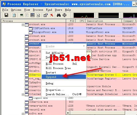 然后,双击U盘上的ProcessExplorer,一眼看到有记事本图标的三个进程,尝试结束其中一个,发现结束后,程序会立即重新启动。看来,直接KILL进程是不行的。结束不行,就用下冻结进程,分别选中这三个进程,单击右键,在进程属性中选择Suspend(暂停)进程,病毒就不再弹出新的对话框,杀它就容易了。(参考下图的示例:)