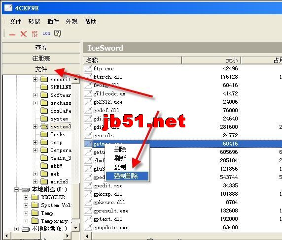 切换到冰刃,简单地通过进程管理,根据病毒进程的程序位置和文件名,轻松使用冰刃内置的文件管理器浏览到这几个文件,复制一个备份到桌面,再单击右键,选择强制删除。