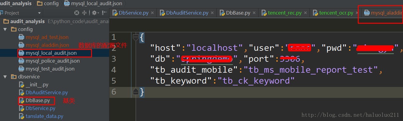 1.python MySQLdb的使用,写了一个基类让其他的sqldb继承这样比较方便,数据库的ip, port等信息使用json配置文件