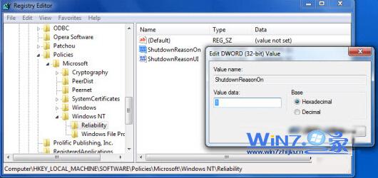 3、接着分别双击ShutdownReason和OnShutdownReasonUI这两项并将其设置键值为1,之后点击确定按钮退出即可。