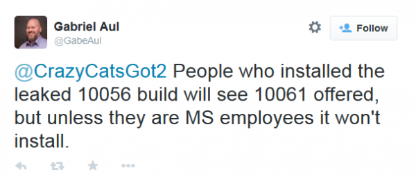 Windows Insider内测主管Gabriel Aul对此做出了解释。他首先确认了Build 10061版本的存在,而且的确已经推送到了Windows Update,但是想要得到它有一个前提:你是微软员工。