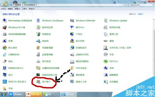 2、完成操作后------点击“控制面板”----页面跳转完成------点击小标示“用户账户”