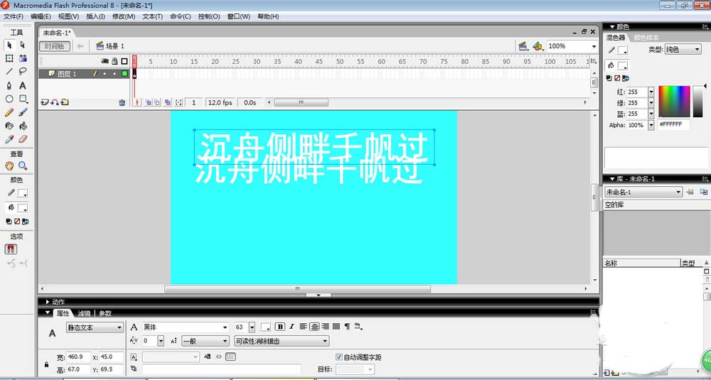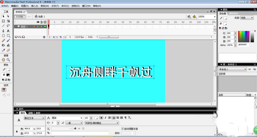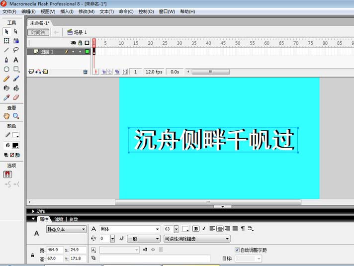 3、利用左侧工具箱中的文本工具,在舞台中输入文本“沉舟侧畔千帆过”,如图,在属性上把字体设置成黑体,字的颜色为白色。