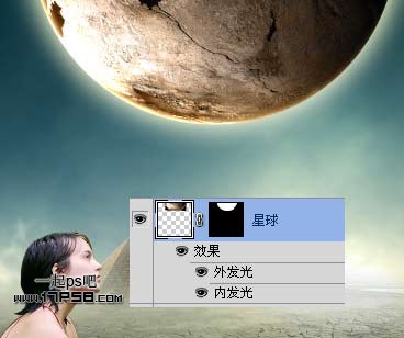 12导入星球图片,选择椭圆工具画一个正圆选区,添加蒙版,添加图层样式,设置默认即可,但尺寸要大一些,把星球放于上方。