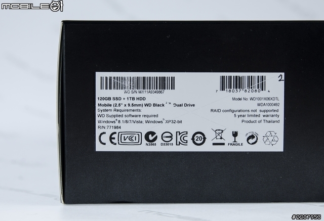 标签上简单明了地写着120GB SSD+1TB HDD,并强调是2.5寸、9.5毫米规格,操作系统支持Windows XP-8.1,但是不支持XP 64位。
