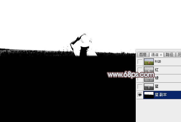 1、打开素材图片,先来把天空部分抠出来。进入通道面板,把蓝色通道复制一层,得到蓝副本通道,按Ctrl + L 调整色阶,把明暗对比增大,确定后用黑色画笔把草地部分涂黑色,如下图。