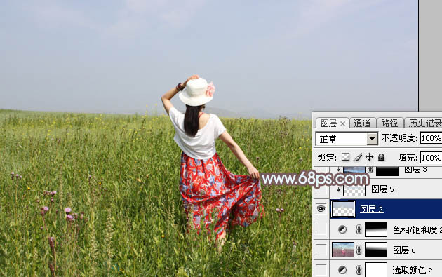 素材图片天空部分比较灰,草地部分的颜色比较杂乱。调色的时候需要把天空和地面分开调色。地面部分主色转为较为统一的暗褐色;天空部分可以重新添加云彩,并调成淡蓝色。