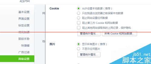 步骤三:在浏览器中选择“高级选项”——将”阻止第三方cookie“取消——”显示图片“