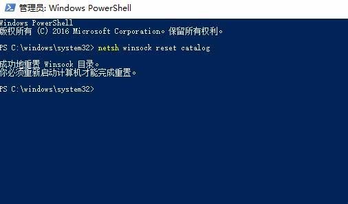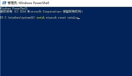 7、这时会打开Windows PowerShell窗口,在命令提示符窗口中输入命令netsh Winsock Reset Catalog,然后按下回车键