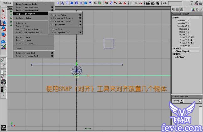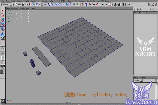 首先我们在MAYA中创建一个plane、cylinder和cube,如图所示。