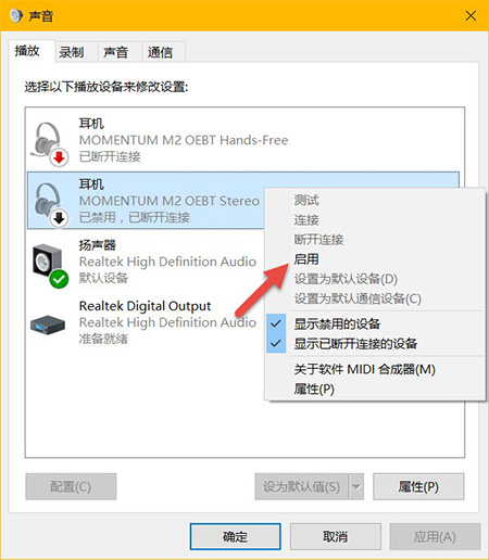 3、将你的耳机连接到计算机,再右键选择「启用」即可。