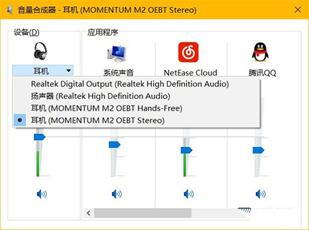 把耳机激活可以使用之后,就可以在「音量合成器」中看到耳机音量的单独配置选项了,在这里对不同设备配置好单独的音量之后,下次再连接耳机时就会自动将 Windows 10 耳机音量调整到你所设置的值。