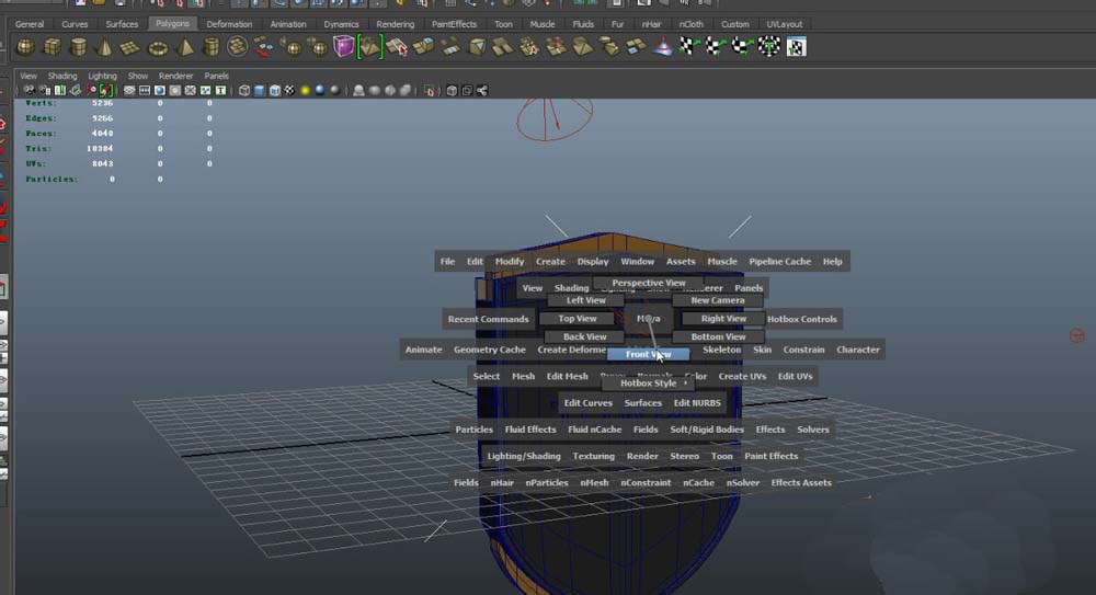 5、我们来切换到你想要测量面的正视图,按住 空格键 按住鼠标右键,maya界面会出现如图界面