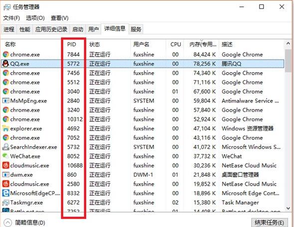 先在任务管理器中,转到“详细信息”一栏,查看下你想关闭程序的”PID“(程序进程编号)是什么!