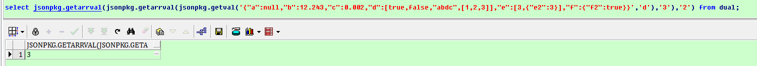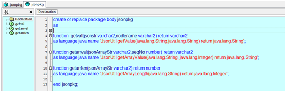 create or replace package jsonpkg as function getval(jsonstr varchar2,nodename varchar2) return varchar2; function getarrval(jsonArrayStr varchar2,seqNo number) return varchar2; function getarrlen(jsonArrayStr varchar2) return number; end jsonpkg; / create or replace package body jsonpkg as function getval(jsonstr varchar2,nodename varchar2) return varchar2 as language java name 'JsonUtil.getValue(java.lang.String,java.lang.String) return java.lang.String'; function getarrval(jsonArrayStr varchar2,seqNo number) return varchar2 as language java name 'JsonUtil.getArrayValue(java.lang.String, java.lang.Integer) return java.lang.String'; function getarrlen(jsonArrayStr varchar2) return number as language java name 'JsonUtil.getArrayLength(java.lang.String) return java.lang.Integer'; end jsonpkg; /