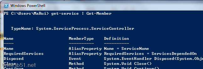 当然,我们可以使用"get-member"的参数来查看"get-service"的所有的属性类对象,或者方法类对象。
