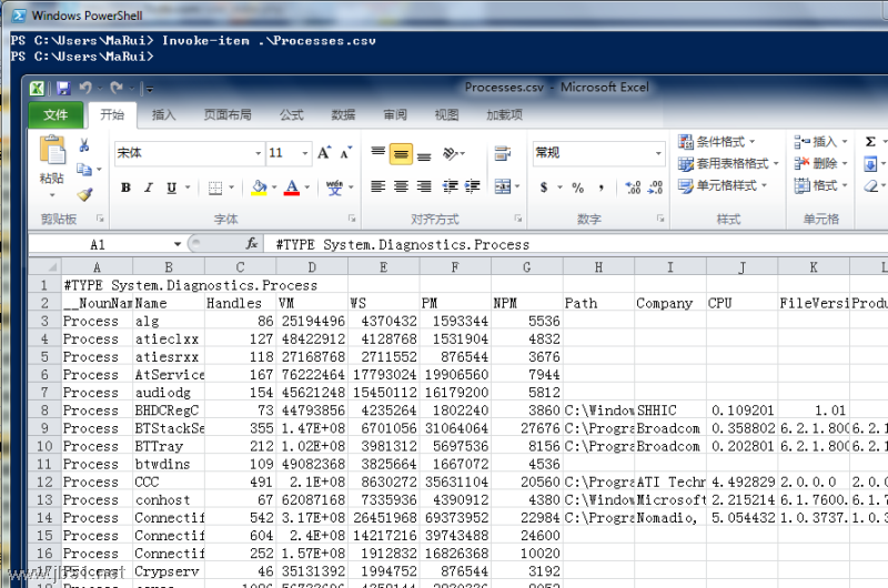 Invoke-Item Processes.csv<enter>