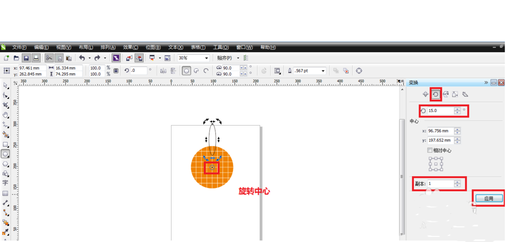 6、选中刚刚绘制的椭圆,按alt+F8进入旋转面板。按如图所示进行设置,设置完成后单击应用。