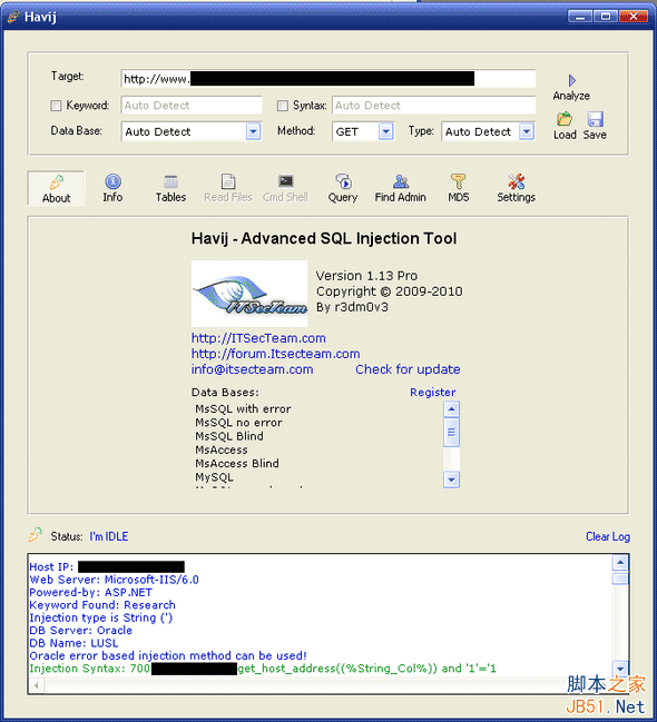Havij是一款自动化的SQL注入工具,它能够帮助渗透测试人员发现和利用Web应用程序的SQL注入漏洞。Havij不仅能够自动挖掘可利用的SQL 查询,还能够识别后台数据库类型、检索数据的用户名和密码hash、转储表和列、从数据库中提取数据,甚至访问底层文件系统和执行系统命令,当然前提是有 一个可利用的SQL注入漏洞。Havij支持广泛的数据库系统,如 MsSQL, MySQL, MSAccess and Oracle。 Havij支持参数配置以躲避IDS,支持代理,后台登陆地址扫描。