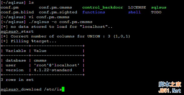 sqlsus是一个开放源代码的MySQL注入和接管工具,sqlsus使用perl编写并基于命令行界面。sqlsus可以获取数据库结构,注入你自己的SQL语句,从服务器下载文件,爬行web站点可写目录,上传和控制后门,克隆数据库等。