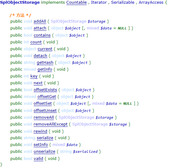 PHP SPL SplObjectStorage类实现了Countable,Iterator,Serializable,ArrayAccess四个接口。可实现统计、迭代、序列化、数组式访问等功能。