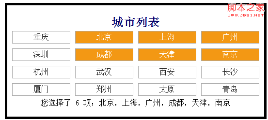 $("#result").text("您选择了 " + selection.length + " 项:" + selection.join(","));