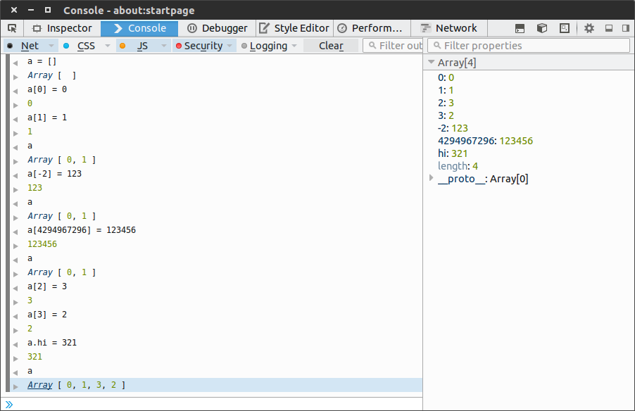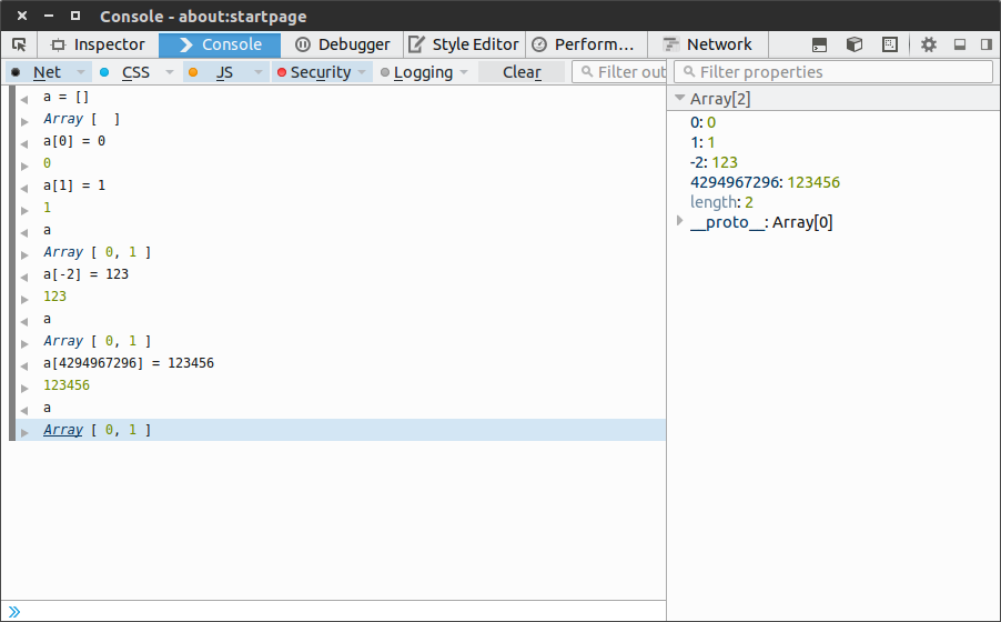 不知道你有没有发现。在右侧,上面几个是数字索引,打印数组的时候能被打印的,而下面几个是属性,打印数组不会打印属性!也就是说,a[-2] = 2;这种语句,这个-2是属性的键,而不是特殊的数字索引的键,-2在被强制转换成正整数的时候,被认为是一个字符串,所以这个-2和4294967296和'name'一样,都是数组的一个属性的键!所以前面说的负索引或是超出范围的索引(应该说是属性的键)都是合法的,它们都是普通的字符串键。
