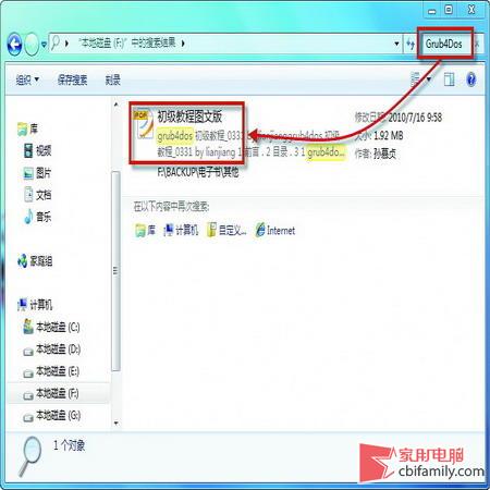 经过以上步骤的操作,当我们打开F盘的根目录并在Windows窗口的搜索框中以某个关键词(如“Grub4Dos”)执行搜索操作时,很快就可以搜索到内容符合搜索条件的PDF文档了。