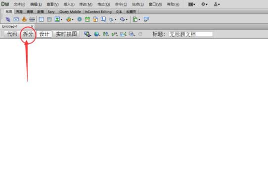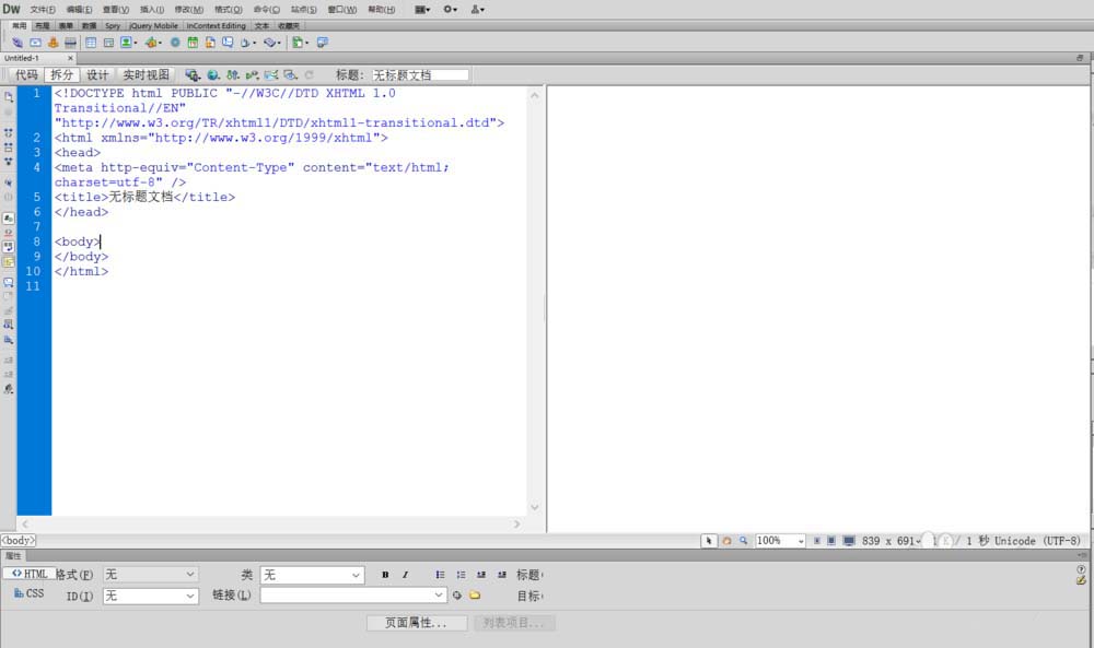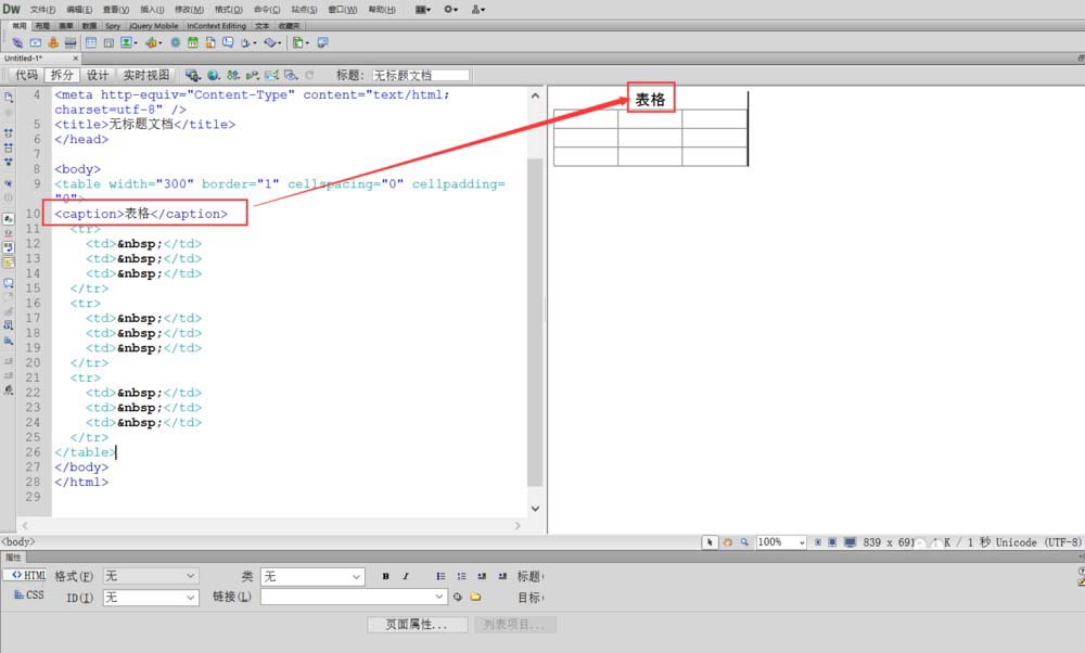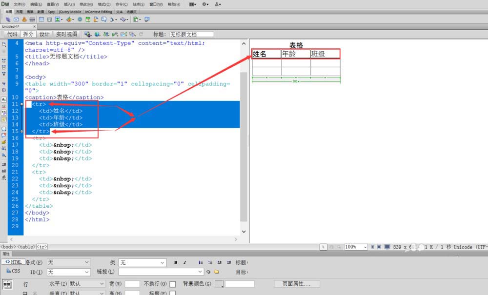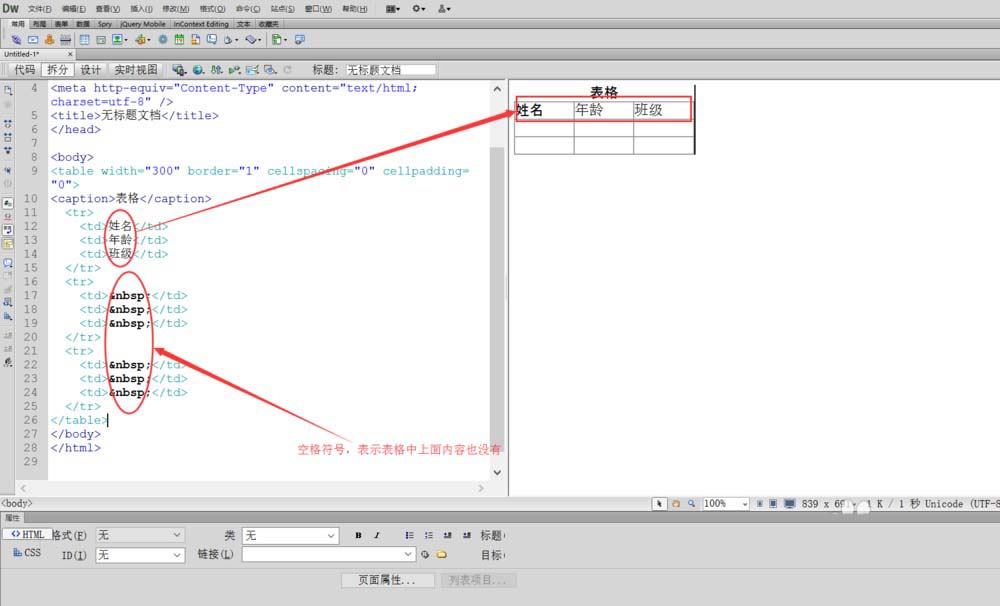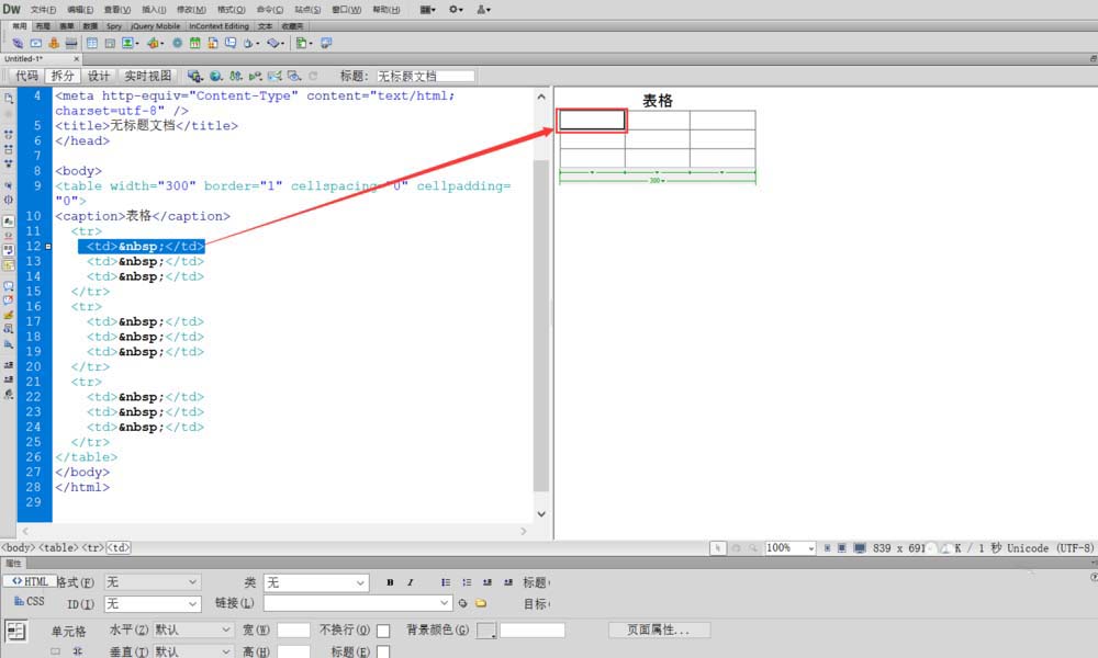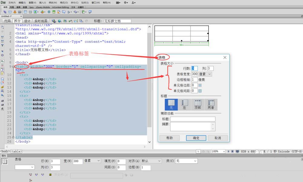 1、首先打开Dreamweaver,进行新建html文件,在“代码,拆分,设计”三个选项中点击拆分项,点击后如图所示,再插入一个3行3列的表格,查看代码区出现的标签及代码。