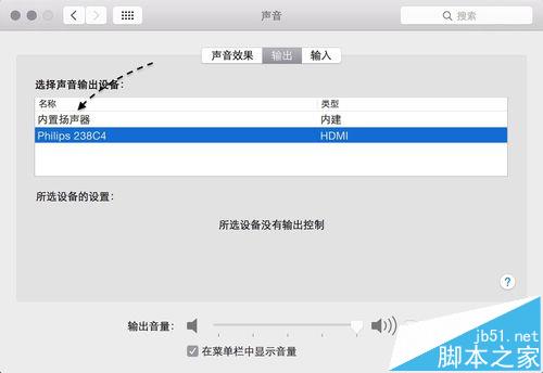 4、随后请确认当前声音输出设备是否有多个,比如我这里外接了一个 HDMI 的显示器,可以输出声音。如果在你的 Mac 上也有多个输出设备的话,请选择“内置扬声器”一栏,即 Mac 自带的喇叭。