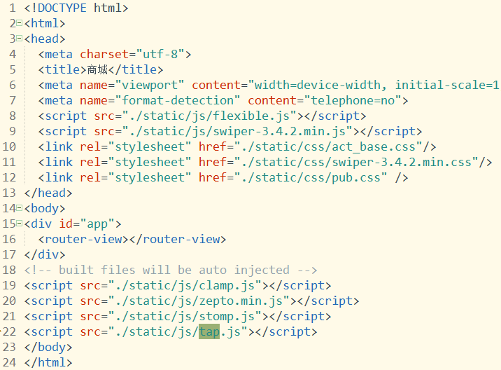 3. 看下我们引入这些异常文件,是在index.html文件中直接引用的,也就是在根路径下引入的。之前的hash模式下,根路径是不会变的,所以我们在index.html文件中直接引入这些静态文件,是可行的,但是使用history模式后,根路径就不固定了。那么这种引入方式就不可行了,所以才造成了上边出现的页面无法渲染的问题: