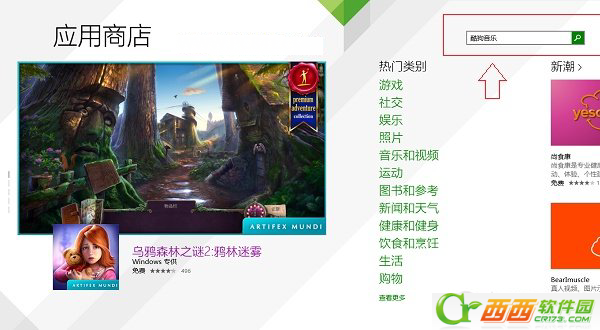 进入Win8.1应用商店后,我们就可以找到自己喜欢的软件安装了,如果没有在首页找到自己喜欢的应用,还可以在右上角的搜索框中,搜索找到,比如笔者要搜索“酷狗音乐”,如下图所示: