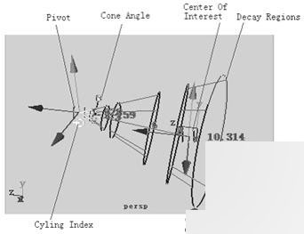 (2) 选取创建的聚光灯,然后执行 Display → Camera → Light Manipulator → Decay Regions 命令,结果如图 7-22 所示。