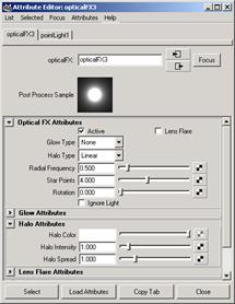 在 OpticalFX 节点属性中的 Optical FX Aattributes 选项组中,选中 Lens Flare 复选框,即可使用镜头光斑效果,同时, Lens Flare Attributes 选项组中的各种属性参数被激活。