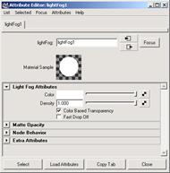 (3) 在聚光灯的 Attributo Editor 中,打开 Light Effects 区域,单击 Light Fog 右侧的指定节点按钮,这时 Attributo Editor 窗口中将列出体雾的各种属性参数,更改 Density 的值为 1.0 。