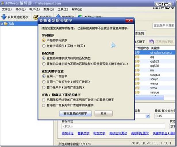 将所有关键词导入编辑器,选择“工具-查找重复的关键字”