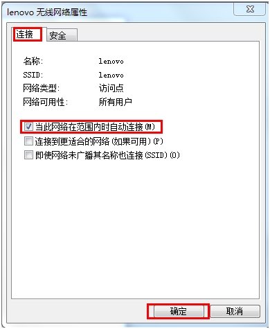 3、点击链接,勾选或取消【当此网络在范围内时自动连接】的对勾,点击确定。
